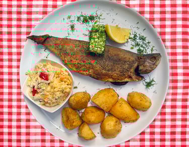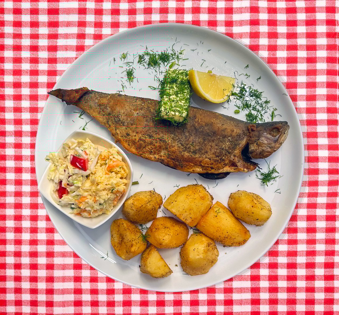 podawany z ziemniakami i kapustą lub frytkami i surówką